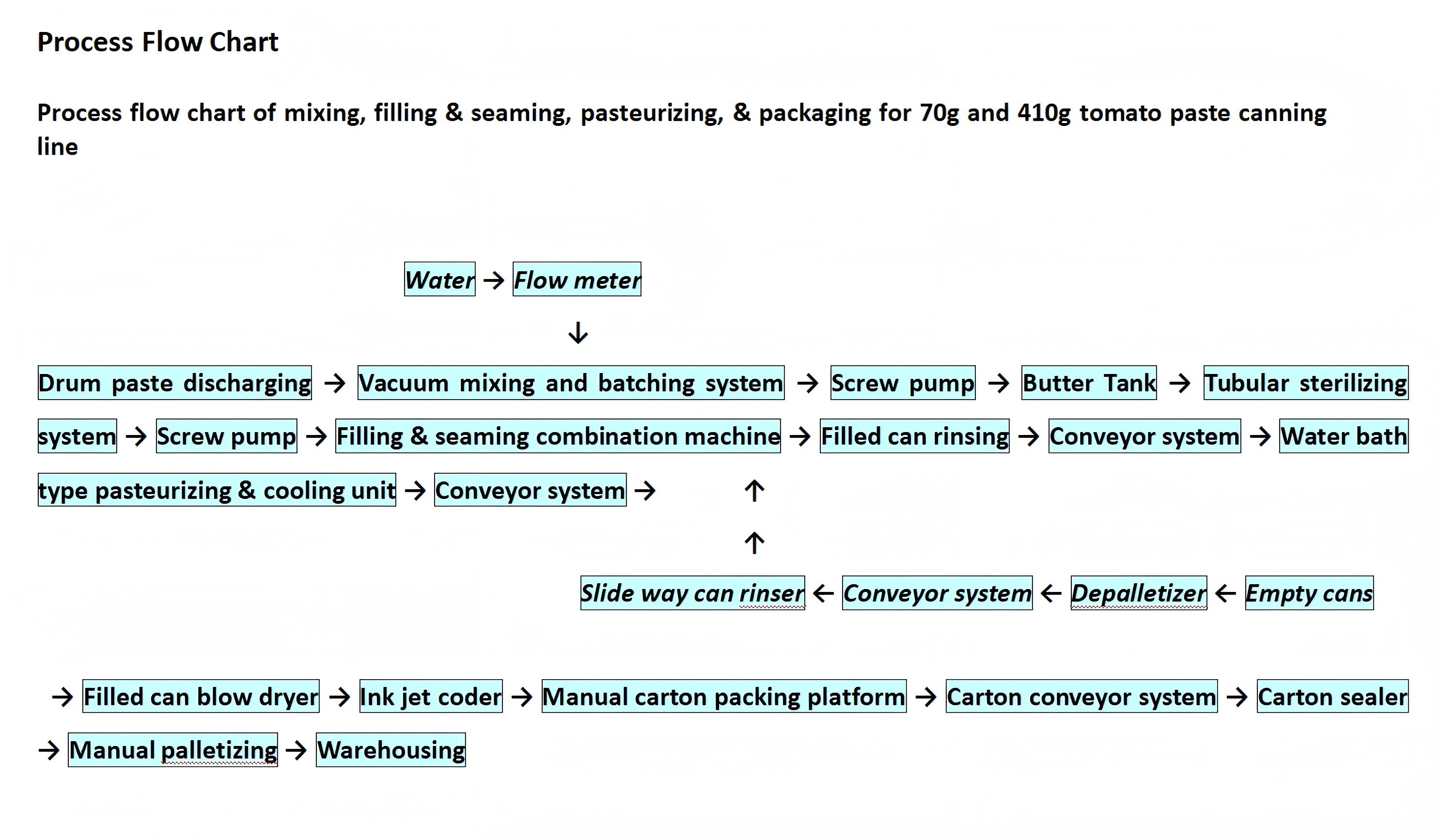 Process flow chart of mixing, filling & seaming, pasteurizing, & packaging for 70g and 410g tomato paste canning line